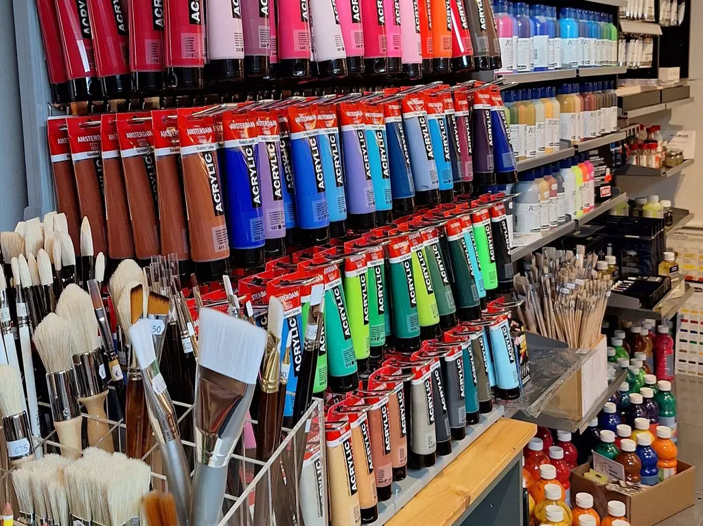 Farben, Acryl, Öl, auch wasservermalbar, Tusche, Ink, Aquarell in Napf und Tube, Linoldruck, Pastellkreide,Öl-Pastelle, Buntstifte, Marker und Fineliner, Graphit und Kohle, Gouache und Pigmente, Pinsel und Spachtel zu den unterschiedlichsten Farben und Techniken passend, Malgründe, Leinwände, Malpappe, Papiere aller Art, Postkarten, Skizzenbücher, Sketchblöcke, Hefte, Hilfsmittel, Firnis, Fixativ, verschiedene Malmittel, Strukturpasten von fein bis grob, Lieferdienst nach Absprache, Ausrüstung für Kunst- und Malkurse