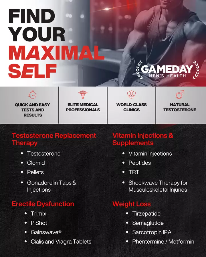 Gameday Men’s Health is a premier men’s wellness clinic specializing in testosterone replacement therapy (TRT), weight loss, sexual health, and overall vitality. With a focus on convenience, comfort, and results, Gameday offers same-day lab results, personalized treatment plans, and top-tier therapies such as peptide therapy, ED treatments (including the P-Shot and Trimix), and weight loss injections like semaglutide. Our modern, man-cave inspired clinics are designed to help men feel at ease while taking charge of their health. Whether you're dealing with low testosterone, struggling with weight, or looking to boost performance and energy, Gameday Men’s Health is your trusted partner for optimized living.